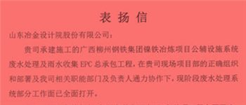 近日,公司總承包的廣西柳州鋼鐵集團鎳鐵冶煉項目公輔設施系統廢水處理及雨水收集工程項目部收到業主表揚信,稱贊項目部在安全、...