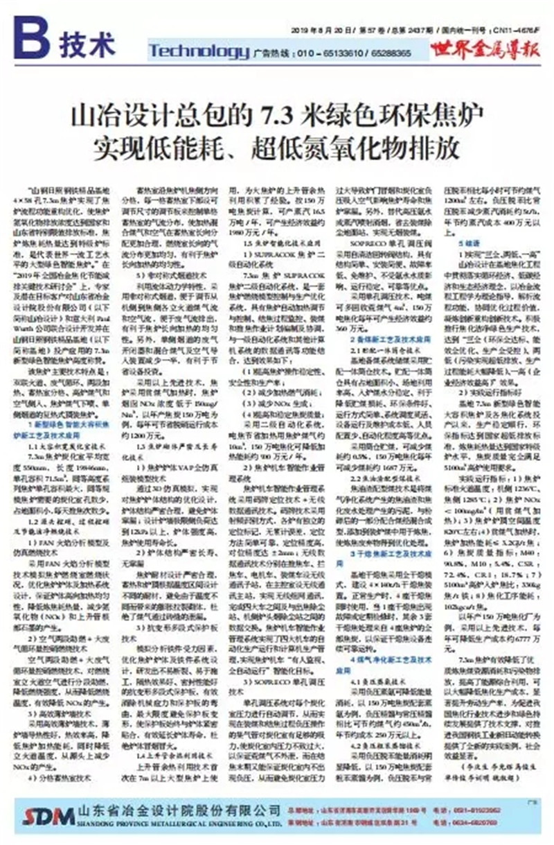 “SDM大型綠色智能焦爐技術”是山冶設計與意大利PW公司合作的代表世界一流工藝水平的大型焦爐技術。由山冶設計進行整體規(guī)劃及設計,采用了分段加熱、非對稱式煙道、薄爐墻、單孔調壓、火焰分析模型等技術,具有技術成熟先進、結構嚴密合理、單孔容量大、占地面積小、熱工效率高、自動化水平高、環(huán)保指標先進等諸多優(yōu)點。在焦爐爐體、焦爐機械、工藝裝備、自動化和環(huán)保水平等方面代表國際先進水平。同時,在世界上首次運用焦爐爐內脫硝工藝,氮氧化物排放指標符合國家最嚴環(huán)保排放標準。