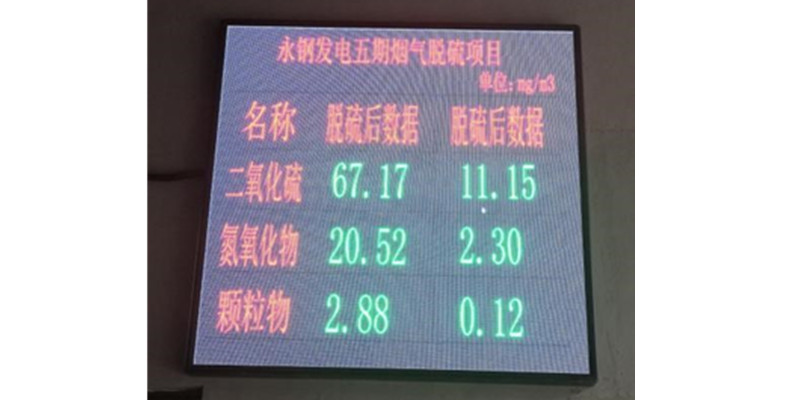 公司EPC總承包的聯峰鋼鐵有限公司電力廠5#煙氣脫硫項目自投運以來,通過對鍋爐煙氣脫硫前后參數的采集與對比,對脫硫劑小蘇打的噴吹量實現自動調節,經過一個月的調試,除塵器出口煙氣含塵顆粒物、SO2,氮氧化物的含量均低于國家超低排放行業標準,達到公司承諾運行保證值,滿足性能考核要求。脫硫后的排放數據實時顯示到大屏,對外公布。