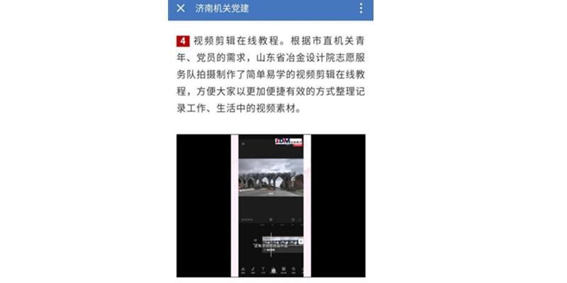41日,為貫徹市直機關青年志愿“區塊鏈”項目部署,公司團委積極組建青年志愿服務隊,結合市直機關廣大黨員、青年掌握簡易視頻剪輯的需要,第三團支部、第六團支部團員青年迅速行動制作了電腦端視頻剪輯教程和手機端視頻剪輯教程,該志愿服務項目得到了市直機關團工委充分認可,并在濟南機關黨建平臺予以推廣。