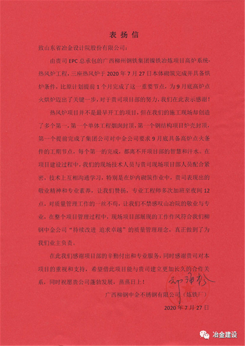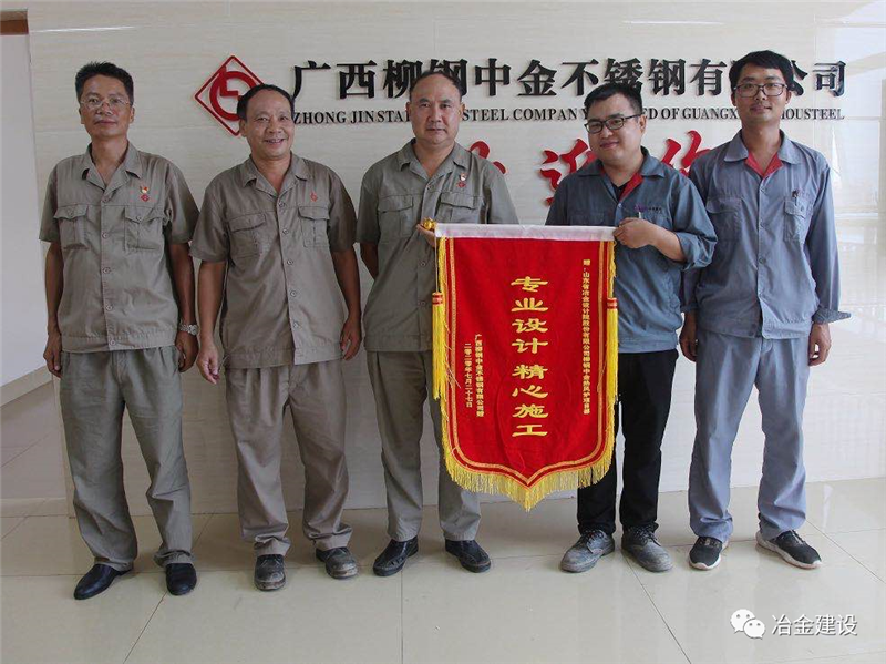 就是憑著這股韌勁和山冶設(shè)計(jì)“敢打硬仗、一切為用戶(hù)著想”的精神,柳鋼中金熱風(fēng)爐工程的各項(xiàng)工作推進(jìn)順利,并多次在安全、質(zhì)量、進(jìn)度大例會(huì)上受到表?yè)P(yáng)。在27日砌筑封頂之后,上午柳鋼中金煉鐵廠(chǎng)送來(lái)表?yè)P(yáng)信,對(duì)現(xiàn)場(chǎng)項(xiàng)目部的工作給予了肯定,下午柳鋼中金公司副總經(jīng)理張洪波授予了現(xiàn)場(chǎng)項(xiàng)目部專(zhuān)業(yè)設(shè)計(jì)精心施工的錦旗,盛贊山冶設(shè)計(jì)專(zhuān)業(yè)、敬業(yè)!