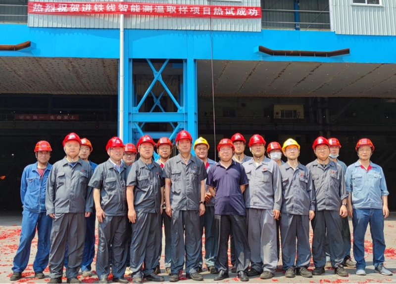 7月1日,在慶祝黨的101周年生日之際,黃海之濱,喜傳捷報,我公司EPC總承包的山鋼日照精品基地鐵水智能快速測溫取樣項目成功熱試!當天下午,橫跨煉鋼廠進鐵線上方的智能測溫取樣平臺上,三套智能機器人經過前期精心調教已進入最佳狀態,胸有成竹地靜坐在軌道上等待著主人的到來,13時30分,日照精品基地煉鋼廠王經理一行來到平臺,詳細了解設備安裝、調試、生產準備情況,煉鋼廠黨政領導對該項目從設計、現場施工、設備供貨直到智能調試,給予高度評價,對總包方的出色表現予以充分肯定,并向我公司送交了表揚信。王經理一聲令下,銀裝素裹的機器人起步行走,準確來到取樣窗口,熟練地展開鋼鐵長臂,下探、取樣、回臂、卸樣、丟桿、復位,現場響起熱烈的掌聲,熱試成功!然后現場舉行了熱烈的慶祝儀式,煉鋼廠黨政領導與參戰各方合影留念。