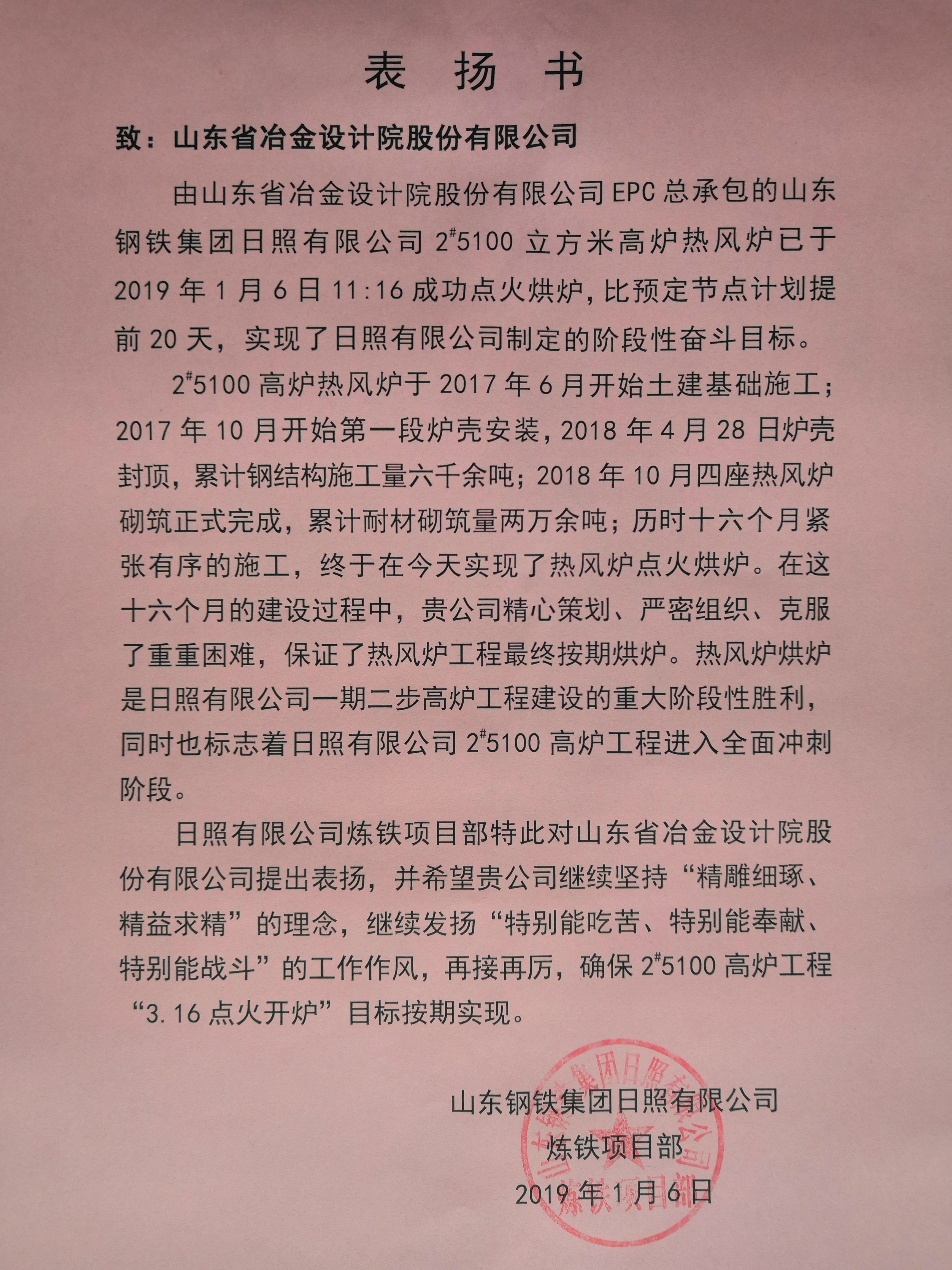 2019年1月6日11時(shí)16分,隨著山鋼集團(tuán)日照公司副總經(jīng)理王子金:“我宣布山東鋼鐵集團(tuán)日照精品基地2#5100立方米高爐熱風(fēng)爐點(diǎn)火烘爐開始”的號令, 由我公司總包的山鋼集團(tuán)日照精品基地2#5100立方米高爐熱風(fēng)爐正式點(diǎn)火烘爐。這標(biāo)志由公司總承包2#5100立方米高爐工程熱風(fēng)爐烘爐的重大節(jié)點(diǎn)比計(jì)劃提前20天實(shí)現(xiàn)階段性奮斗目標(biāo)。公司副總經(jīng)理劉洪亮參加烘爐儀式并發(fā)表了講話。當(dāng)天,山東鋼鐵集團(tuán)日照有限公司向公司發(fā)來了表揚(yáng)書,贊揚(yáng)山冶人堅(jiān)持“精雕細(xì)琢、精益求精”的理念,希望再接再厲確保后續(xù)工作目標(biāo)如期實(shí)現(xiàn)。